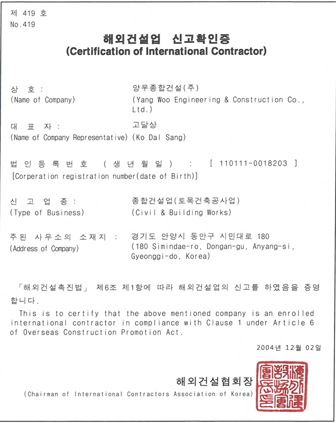 해외건설업 신고확인증